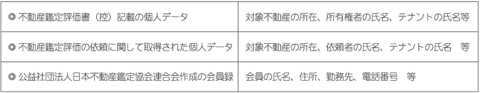 弊所が不動産鑑定評価等業務の過程において取得する各種個人情報につきましては、地価公示・地価調査ほかの公的評価及び不動産鑑定士等が行う